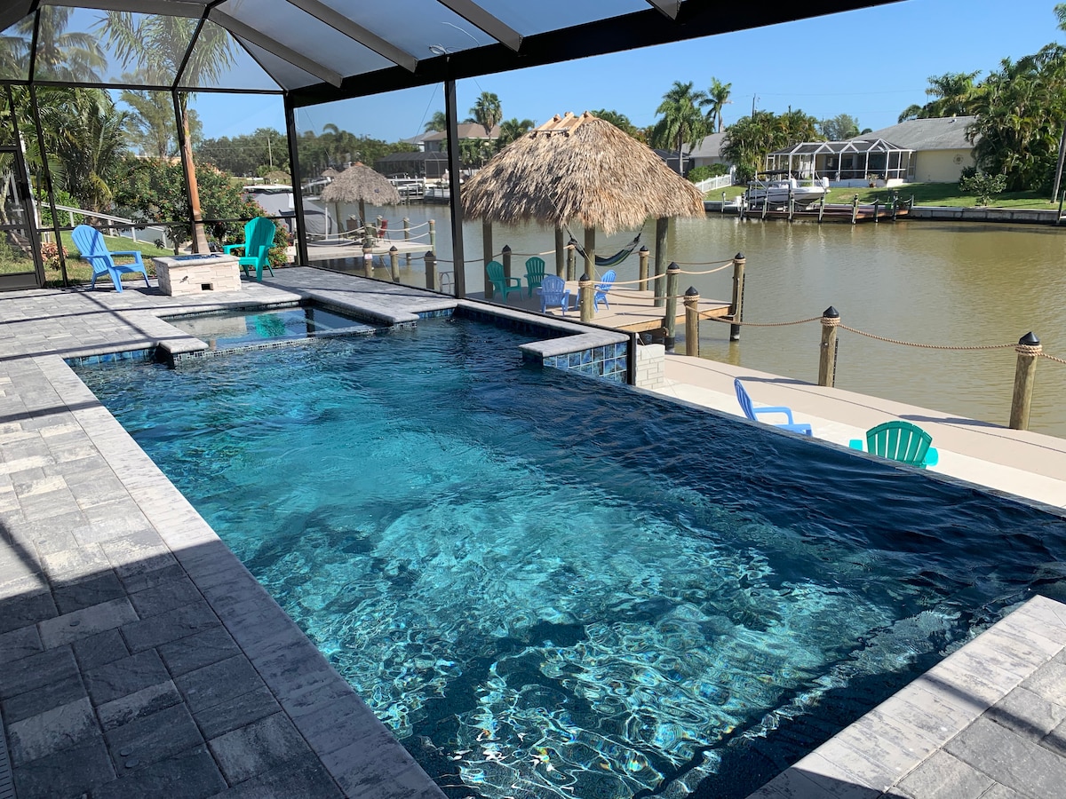 This beautifully modern 3 Bedroom – 2 Bathroom villa features just under 2000 sq ft a large custom heated saltwater pool & spa and a private tiki stretching 25ft into the canal, and all the comforts of home, you deserve on your much-needed Southwest Florida vacation. The villa has modern tile flooring throughout, so ideal for allergy sufferers, is air-conditioned and can accommodate up to 6 people.
