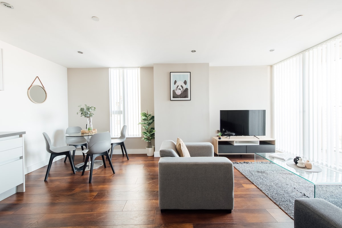 - 60-78 sqm / 645-839 sqft apartments. - Sleeps 3 - Double bed (180x200cm / 71x79in). An additional single bed is available on request. - Fully-equipped kitchen (dishware, cookware, dishwasher, fridge, microwave). - Coffee machine with pods. - Washer/dryer in-unit. - Dining table, sofa, arm chair and smart TV. - Ultra high-speed Wi-Fi. - Modern bathroom with shower, towels, and Bramley toiletries. Every apartment is unique, so your space may differ slightly from photos.