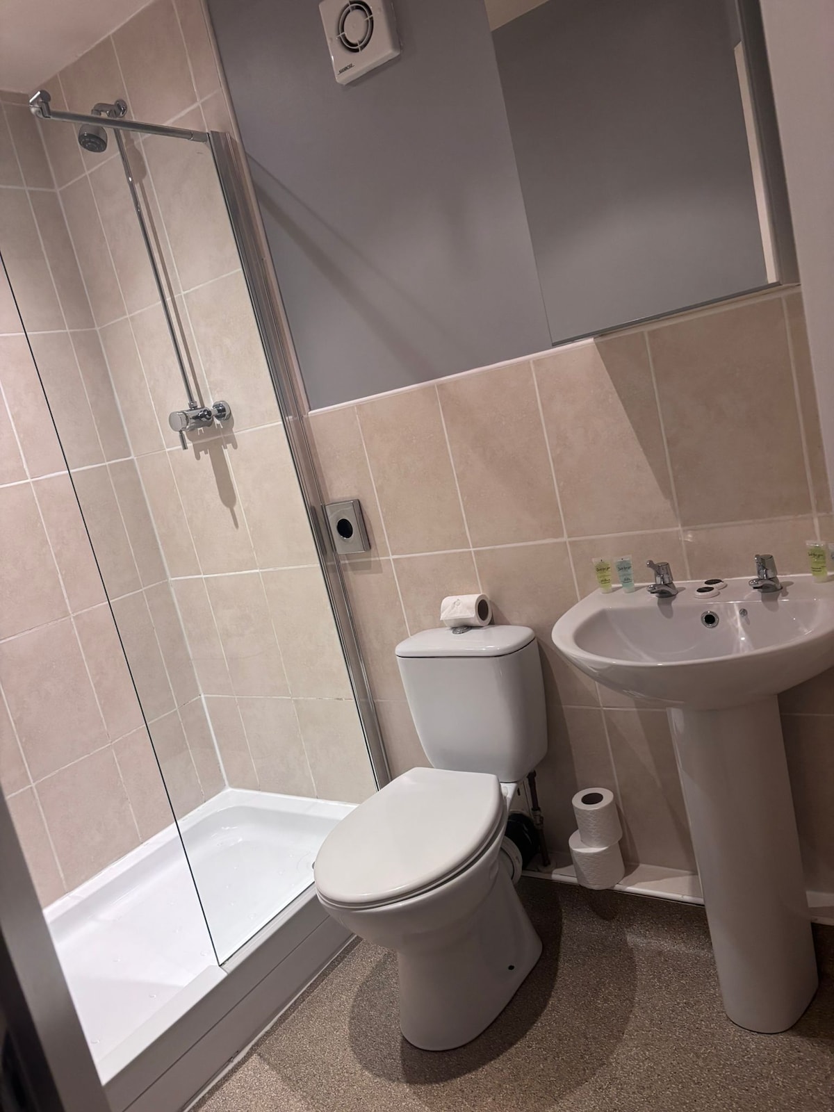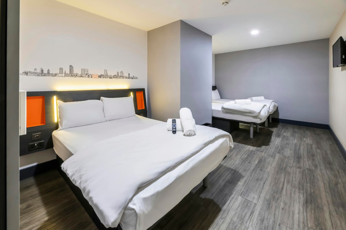 This simple room with a double bed and two single beds is compact, smartly designed, and just what you need for a solid night's sleep. It's all about getting you great value and keeping things green with our simple, low-carbon approach. The room offers air-conditioning, TV, free Wifi and ensuite bathroom for your comfort. Room size 15sqm. 50£ refundable deposit required. £50 refundable deposit is required at check-in.