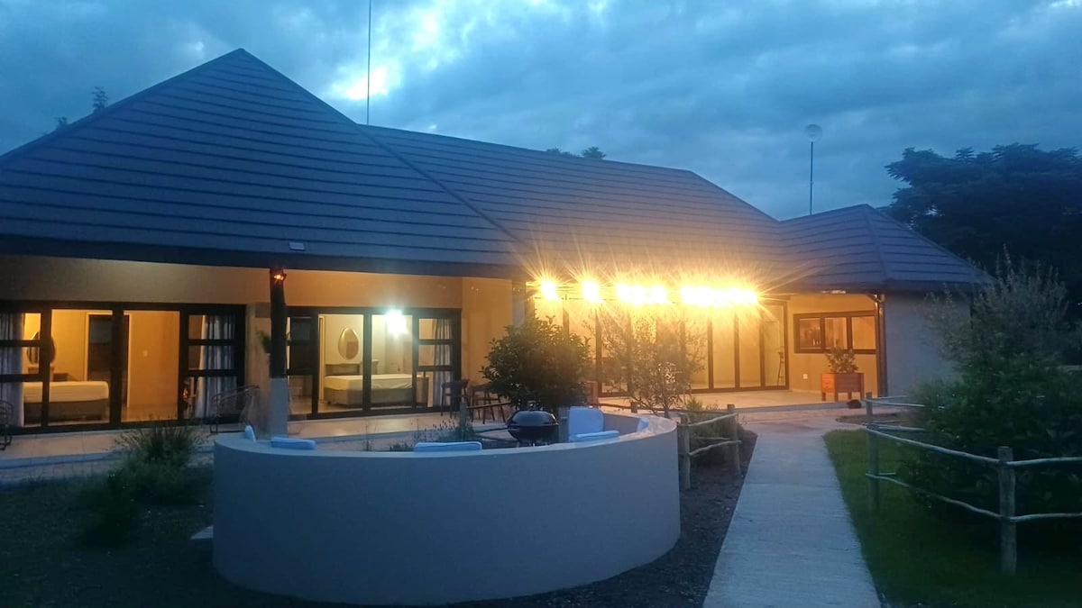 Forget your worries in this spacious and serene space. Lodge 97 is privately nestled between trees - often bustling with birds and squirrels who love to be spoiled with fruit and bread crumbs. This property is ideal for families, couples or mature people who want to enjoy nature and tranquility. Hiking and cycling among wild life are popular activities. The clubhouse on the estate (10 min. drive) provide activities such as golf, spa, game drives, swimming pool, gym, restaurant, padel.