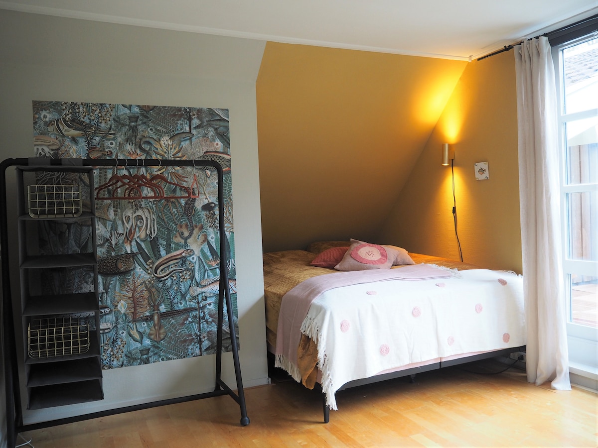 This spacious room is on the ground floor. The room offers lots of privacy. A private shower with toilet is adjacent to the room. The newly renovated room is attractive and has a king size box spring (October 2024). There is a coffee maker. Breakfast is possible, you decide when you want to eat the breakfast, €11.50 p.p. The apartment is centrally located. You can walk within 7 minutes to the city centre of Leeuwarden and within 3 minutes to the station (0,25 miles).