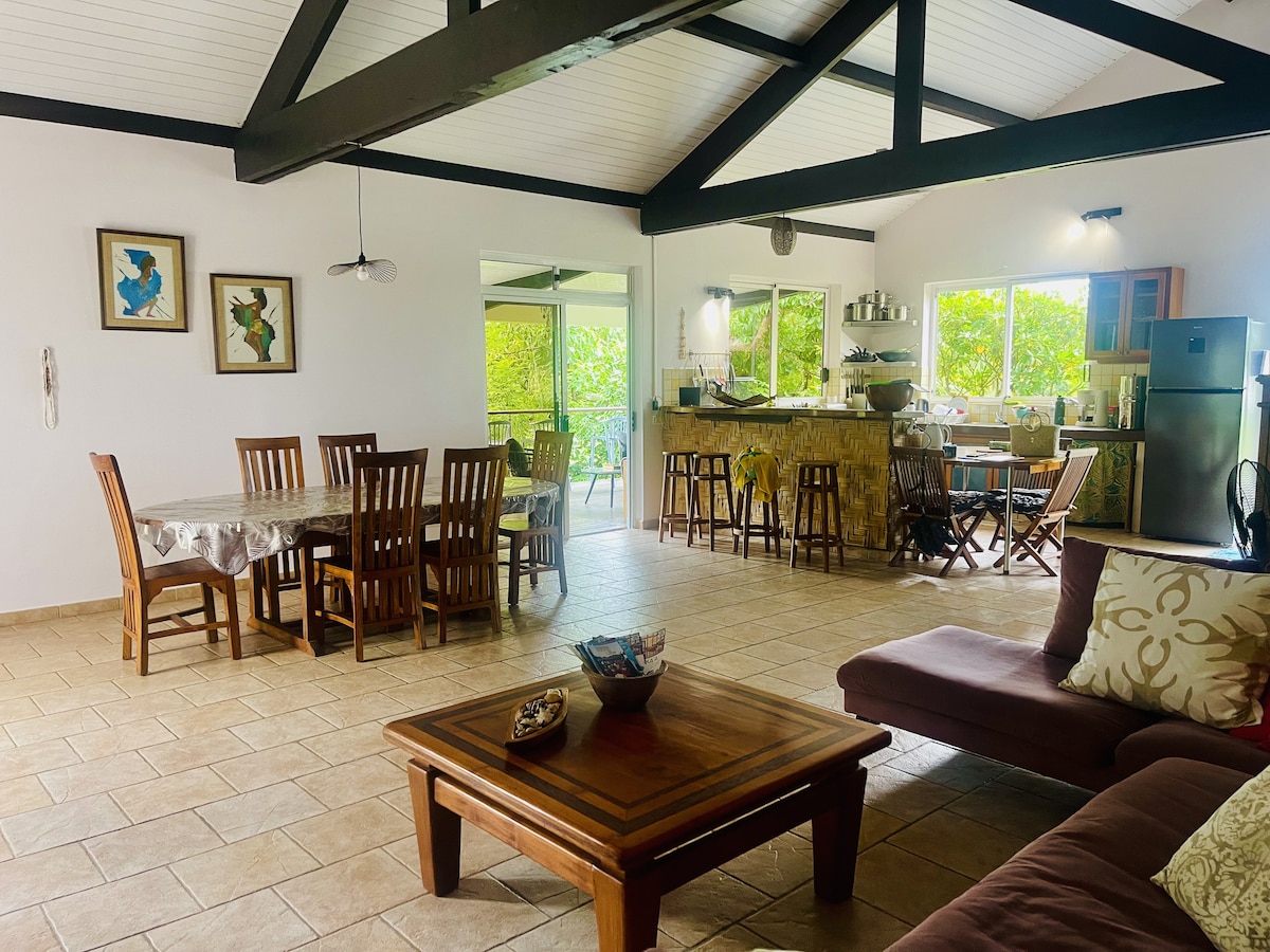 This spectacular eco villa is nested on top of a hill in a lush and serene 0.5 acres private property surrounded by a tropical forest for an ultimate nature communion experience . The large wood deck and bay windows are overlooking the tropical garden with mango, coconut, banana trees, pineapple and wild vanilla .Recently fully renovated to provide a world class, eco friendly ultimate relaxing tropical experience. Ideally located in the heart of Huahine ,a few minutes drive from beaches.