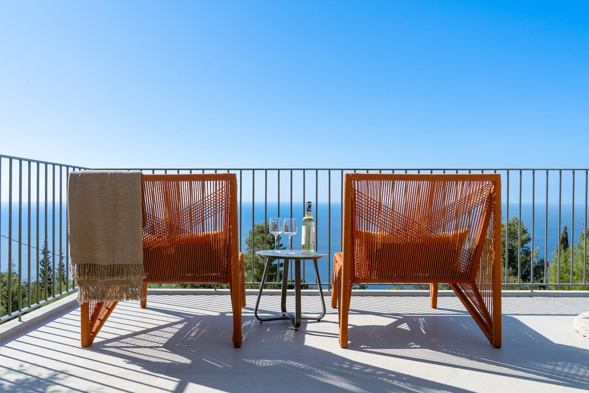 A newly built stone villa perched on a slope near the western coastline of Lefkada. The villa blends seamlessly with the natural landscape, while large windows frame breathtaking vistas. The villa's spacious terrace offers a front-row seat to this harmonious dance between land and sea, where sunrises paint the sky in hues of gold and indigo.