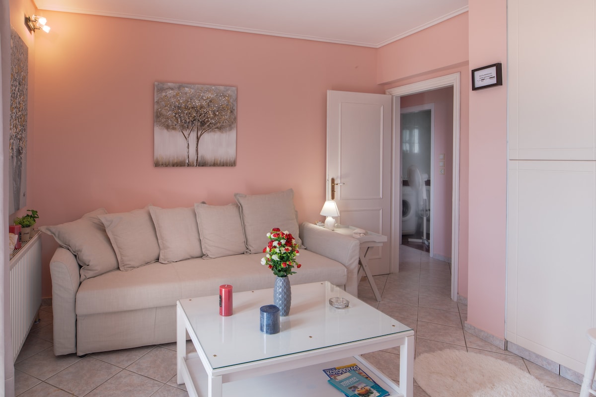 Beautiful and cozy apartment just 200 m far away from the beach of Agios Ioannis & 1500 m from the center of the town! It has 2 bedrooms with a beautiful view towards the mountain and a swimming pool, a fully equipped kitchen, a living room with sofas that can be developed into beds, a bathroom, a laundry machine, air conditioning and a TFT television in every room. It has, also, its own balcony along with garden furnishing.