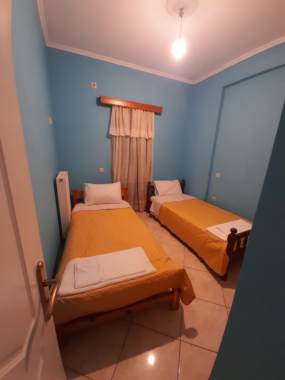 It's right on the beach! All apartments can accommodate up to 4 people. They all have two rooms. The one room has a double bed with COCOMAT matress and the other room has two single beds. Every apartment has a furnished balcony/patio, a fully equipped kitchen, TV, A/C, and a bathroom with shower. All apartments share a big green yard with sun beds, garden tables, chairs, umbrellas and shower. In case you can't find availability in this listing please visit our second one, Fetsis Apartments 2.