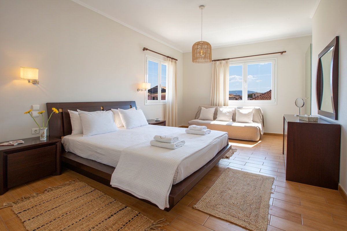 A spacious stone-built villa offering breathtaking views of the sea and mountainside. This spacious retreat features an infinity pool, expansive terrace, and elegant garden, just 150 meters from the pristine Kaminia Beach. Perfect for families or small groups, it accommodates 4-6 guests with two beautifully appointed bedrooms and comfortable sofa beds, ensuring a restful stay in a serene environment.
