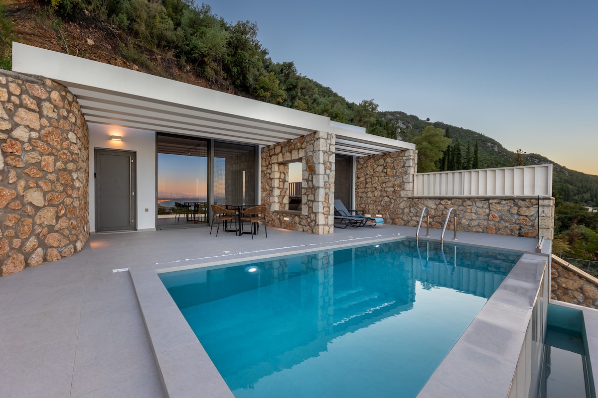 Heavenly Heights Villas is an exclusive three-villa retreat in the picturesque village of Evgiros, Lefkada, where dramatic mountain landscapes meet the endless blue of the Ionian Sea.Designed to host up to five guests, each villa offers an exquisite blend of elegance and comfort, making it the perfect sanctuary for families or groups seeking a refined escape.Expansive private outdoor spaces and individual pools invite guests to unwind in absolute seclusion, enveloped by the raw beauty of nature.