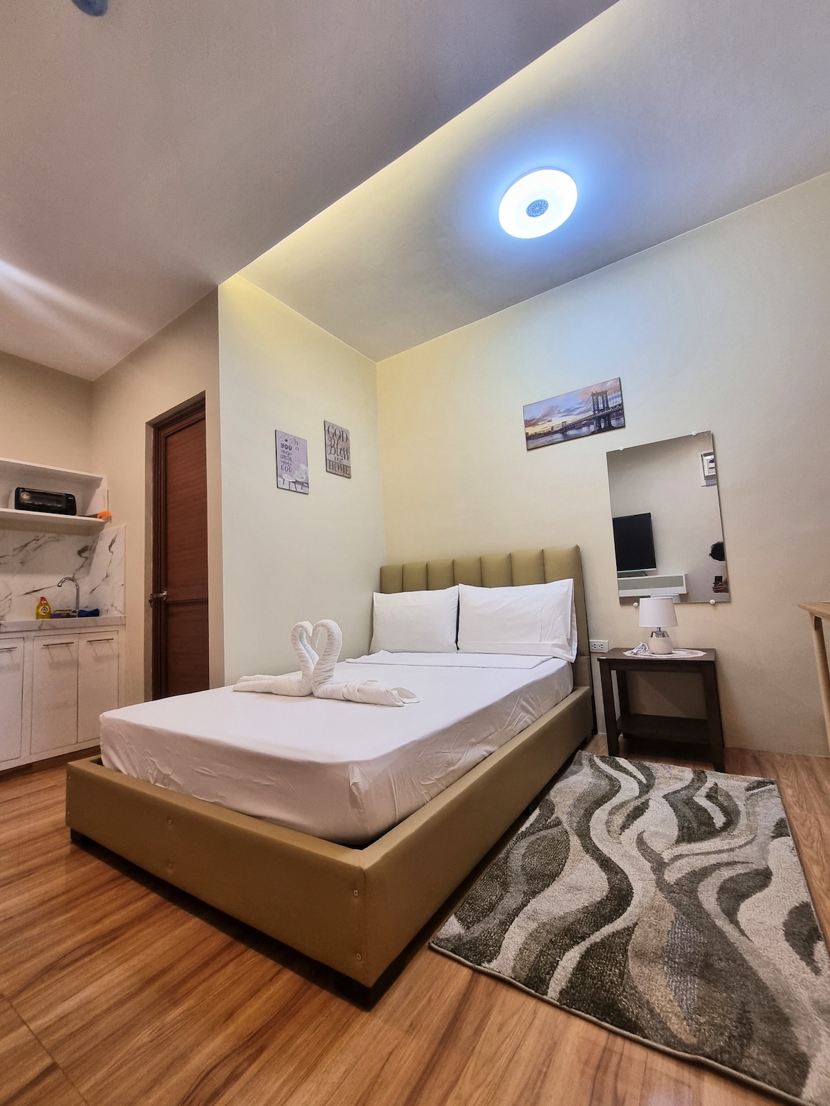 A for Location. It's in the heart of the City. 20 seconds walk to Yashano Mall, 1-minute walk to SM City Legazpi - Bus Terminal. our unit is simple furnished 2 bedroom studio apartment w/ parking. Airport transfers w/ fee.