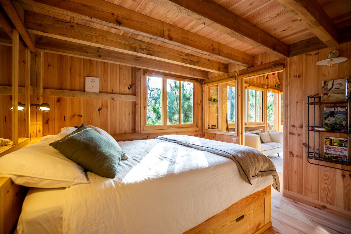 Cette propriété familiale possède une vue hors norme sur le bassin d'arcachon, son emplacement en position dominante donne à votre cabane un sentiment d'exclusivité et de bien être. La forêt de pins d'un côté, le bassin au rythme des marées de l'autre, voici un cadre idéal pour se ressourcer au plus près de la nature. Attention ! Veuillez bien noter qu’il n’y a pas de cuisine mais seulement un micro-onde, un mini bar et une machine Nespresso. De la vaisselle est à votre disposition.