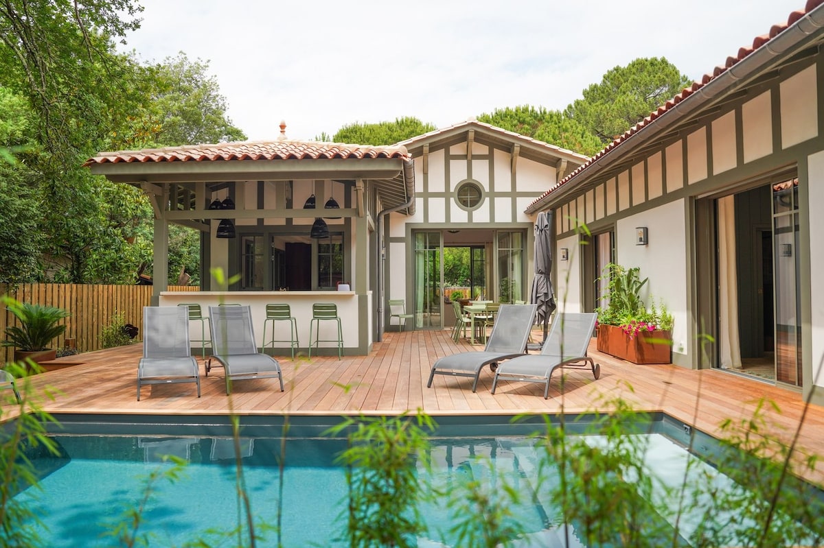 Détendez vous dans ce logement calme et élégant au bord de la piscine chauffée (dispo de 9h00 à 22h00)Dans un jardin verdoyant, vous pourrez profiter du chalet en toute intimité pour vous ressourcer après une journée à la plage (à 10 min en voiture) ou autour du bassin d'Arcachon (10min) Accessibles par pistes cyclables. Parking sécurisé , table de ping pong / pétanque .Ouverture piscine à compter du 01/05 Possibilité de louer une planche de surf à la journée : 15€ PETIT DÉJEUNER INCLUS