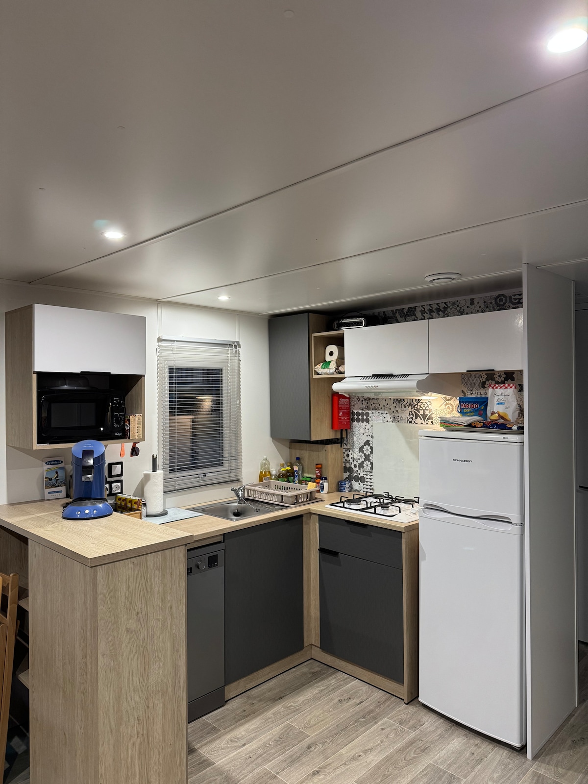 Mobilhome dans camping 4 étoiles sur la presqu'ile du Cap-Ferret. Chambre parentale avec 1 lit double et dressing attenant, 2 chambres avec 2 lits séparés. Cuisine entièrement équipée avec plaques de cuisson au gaz, four au gaz, micro onde, cafetière dont une dolce gusto, lave vaisselle, frigo avec congélateur... 1 grande TV dans le salon et 1 machine à laver à disposition. Climatisation. Grande terrasse couverte, terrain avec table, plancha, 2 bains de soleil ...chiens non acceptés (allergie)