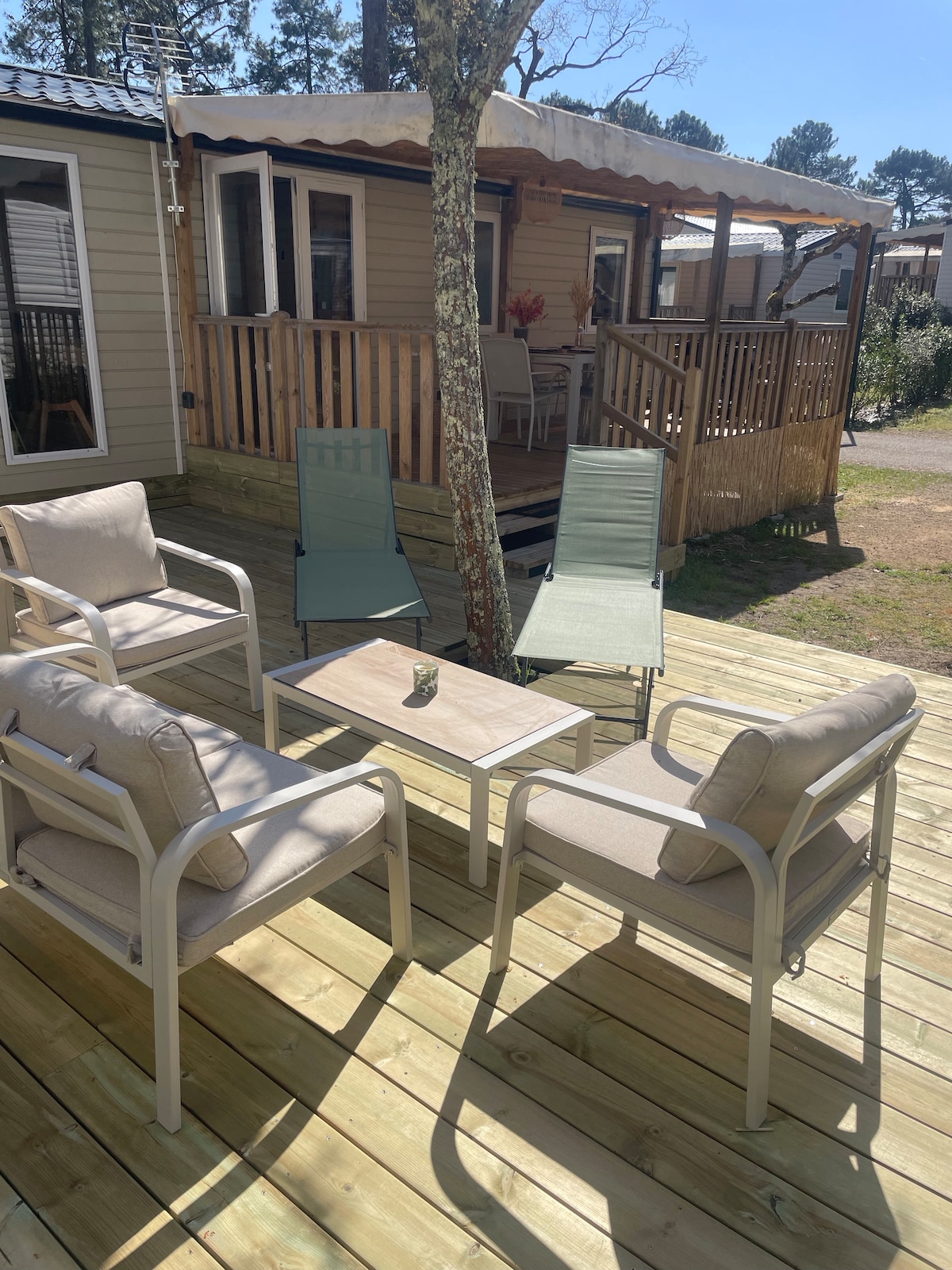 We discovered the peninsula of Cap Ferret in the spring of 2021. We had a huge crush on this region full of authenticity, romanticism, located between the Arcachon basin and the ocean. We welcome you in a charming new bungalow of 40 m2 with a terrace located in a totally redone area of the campsite Les Viviers taken over in 2019 by Siblu. That's it, everything is ready to welcome you! See you soon!