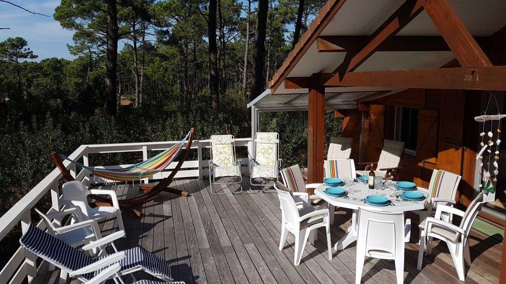 Mobil home « La cabane des pins" situé au camping 4 étoiles SIBLU « les Embruns » à Claouey, commune de Lège Cap-Ferret dans la presque île du bassin d’Arcachon. Le mobil home est situé sur emplacement calme et ombragé proche de toutes les commodités. Ce dernier est neuf, il fait 40m2 et peut accueillir 8 personnes. Il est composé de 3 chambres et un salon avec couchage, une cuisine équipée, le tout avec 2 terrasses dont une couverte avec plancha gaz.