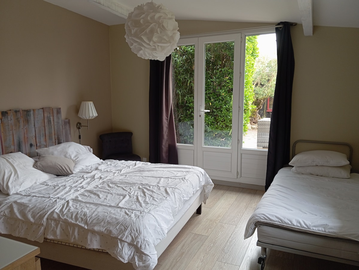 Dépendance de 55 m² idéalement située à proximité directe des commerces et des pistes cyclables. Arès est un petit village qui privilégie la nature, vous pourrez faire de nombreuses ballades à pieds ou à vélos. Les commerces n'y manquent pas, la place du village sur laquelle vous trouverez tout ce dont vous avez besoin, boulangeries, pharmacies, supérettes, restaurants, coiffeurs.. et à environ 400 mètres deux grandes surfaces. Linge et ménage de fin de séjour en option 30€/lit- 40€ ménage
