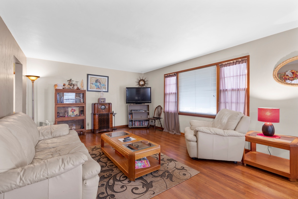 Beautiful 2 bedroom house with queen bed in each, living room, kitchen, necessities, dishwasher, washer & dryer, AC, front porch, back yard & big driveway. Travelers will be given a code to enter door. It includes wifi, usb charging port, computer desk & chair. It is provided with coffee & tea. Help yourself to any snacks. There are cards, games and books to pass the time. Spectrum cable on roku TV. Minutes to downtown, Midland, 31 West, Denison Univ, National Trails, Babe Ruth & golfing.