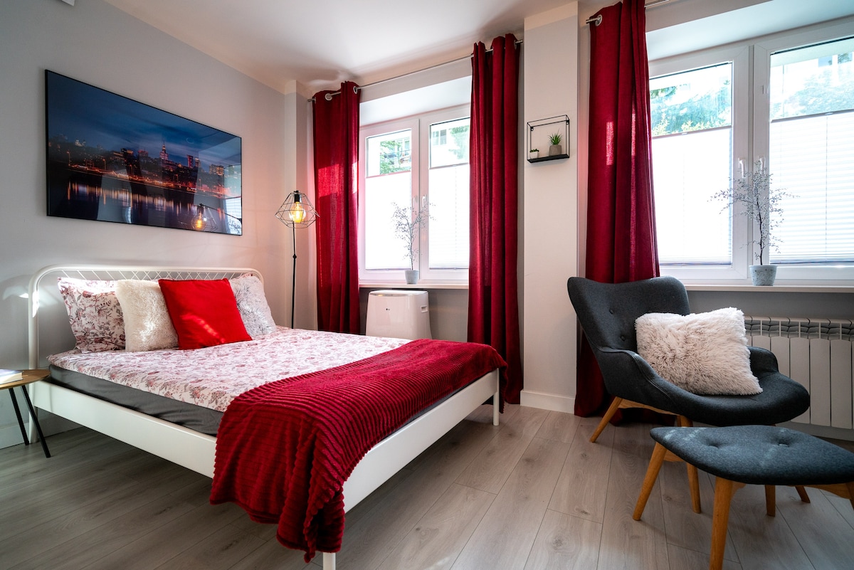 Hi, Cześć, Welcome! Saska Kępa Studio apartment is a cosy and fully equiped space in the heart of popular Saska Kępa district - just across the river from city Center! The apartament is on the ground floor of a residential building complex (security, minitoring) next to Rondo Waszyngtona. The apartment comprises of a corridor, a living space with a sofa, dining table and a kitchen, a sleeping annex, a bathroom with a shower. Next to Vistula river and PGE National Stadium. Come visit Warsaw !