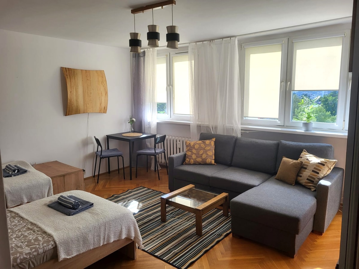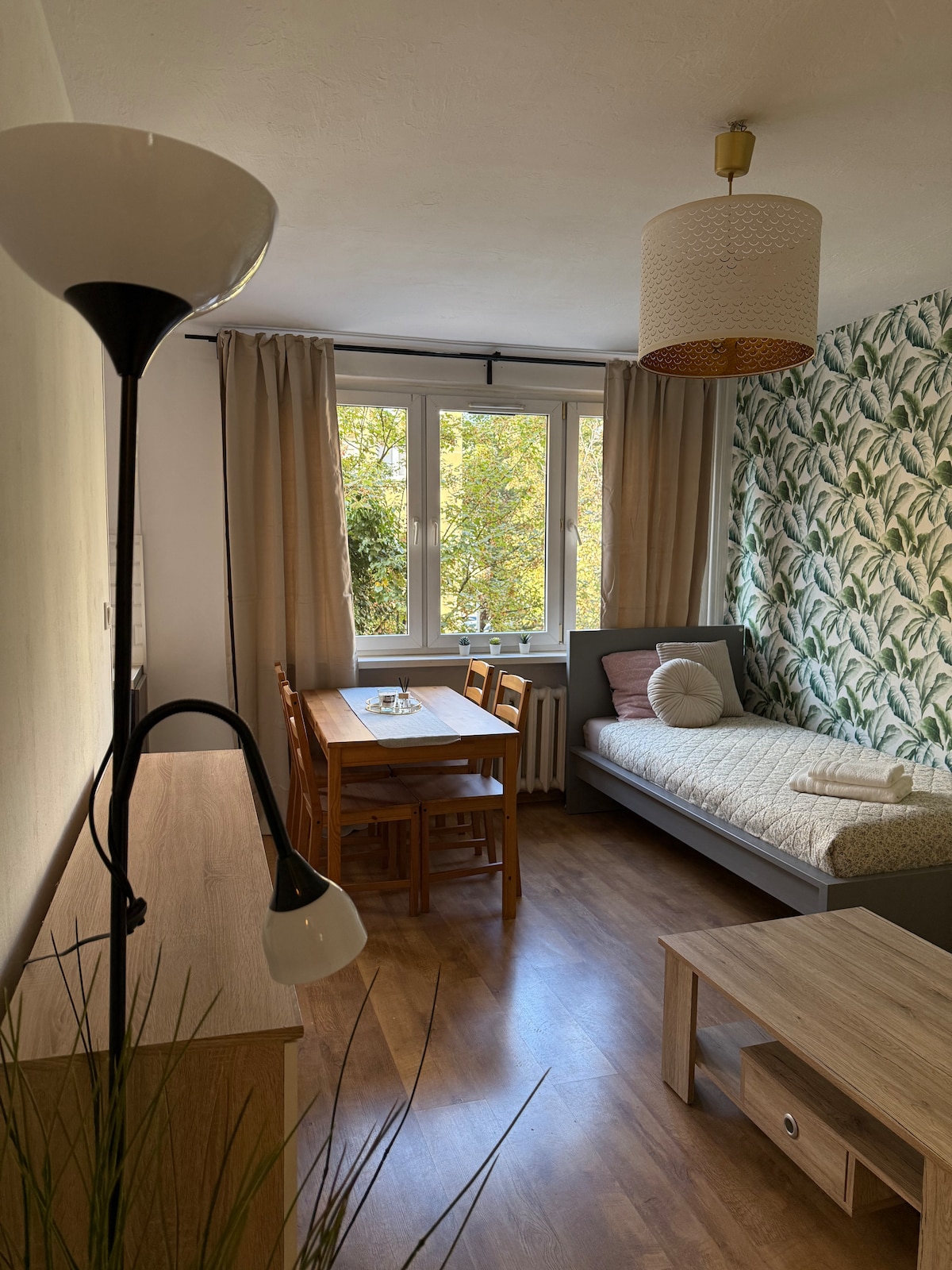 Przytulne mieszkanie typu studio w sercu Legnicy. 8 minut spacerkiem do Rynku i tyle samo do pięknego legnickiego parku oferującego liczne atrakcje. Mieszkanie w spokojnej kamienicy na ostatnim, trzecim piętrze (kamienica nie posiada windy i wymaga remontu). Klatka jest bezpieczna, zamykana na domofon. W pełni wyposażony aneks kuchenny dzięki czemu można wygodnie przygotować i zjeść posiłek. Do dyspozycji gości jest TV, żelazko, suszarka do włosów. W najbliższej okolicy sklepy i restauracje.