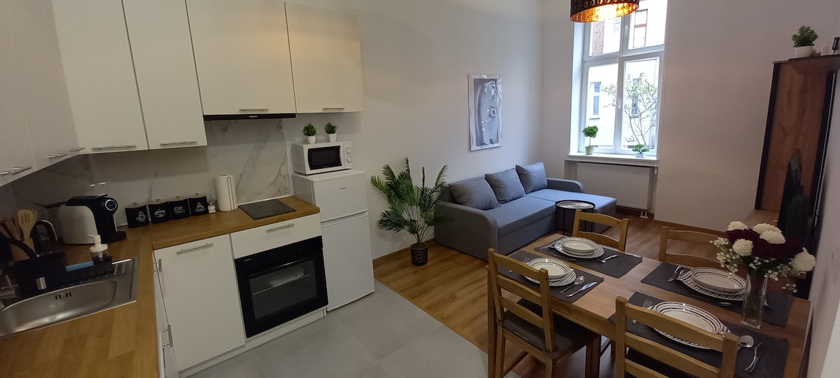 Enjoy a stylish experience at this centrally-located place. An unique apartment in the city center of Legnicy - located in the second floor of a beautiful building. The apartment has two rooms - the living room with a full equipped kitchen and a bedroom with a queen sized bed. The apartment is new renovated.