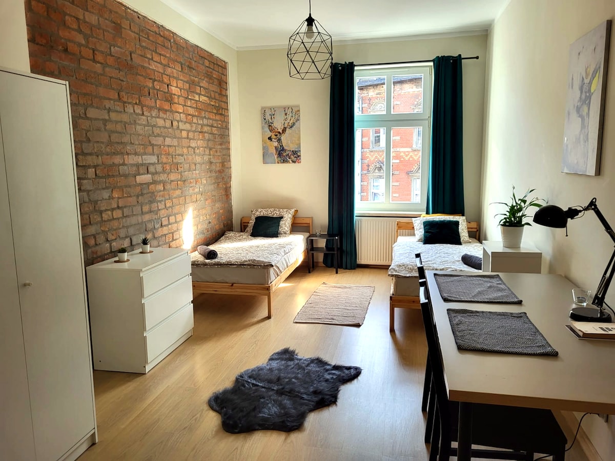 Nowoczesny LOFTOWY w pełni wyposażony Apartament 81m2 w centrum miasta LEGNICA. Dwie sypialnie i salon z kuchnia zapewnia Państwu udany pobyt z cała rodziną, ale również spełni oczekiwania ludzi biznesu. W pobliżu znajdują się: katedra, teatr, muzeum, kino, 3 galerie, kręgielnia, pub-y, restauracje ( włoska, polska, wegetariańska, kebab) , banki, apteki, basen, siłownia, stacja paliw. Główny deptak miasta zapewnia dużo atrakcji. Apartament jest na 1 piętrze w zadbanej kamienicy.