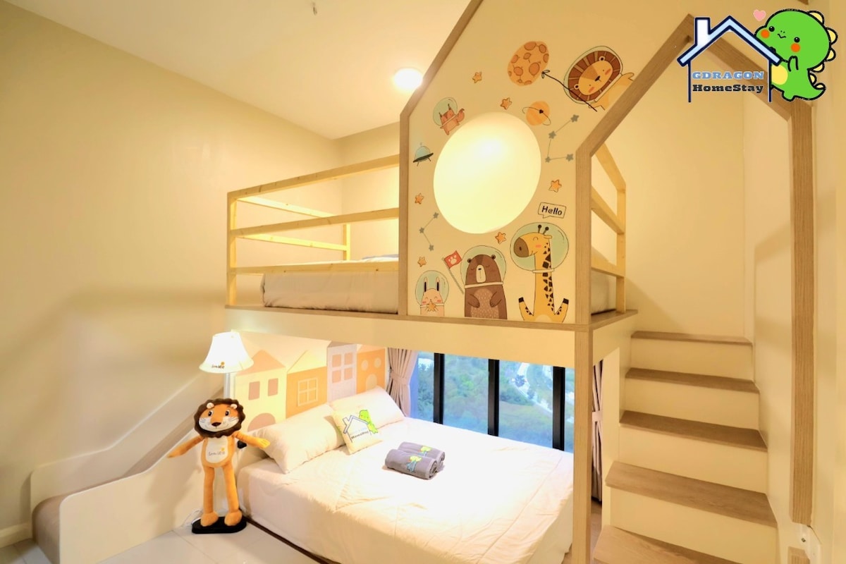 Modern design and comfortable Ultimate Kids-Friendly Haven Airbnb Experience 2-bedrooms just for you: - Master Bedroom: Loft Bedroom with Slides -2 Queen bed -Second Bedroom : Loft Bedroom Up-single bed Down- 1 Queen bed and Baby Cot Within walking distance to Legoland and Gleneagles Hospital, we offer easy unwinding for adults while kids invent their treasured memories . -Kid & Baby-Friendly Bed with Slides, High Lego Wall & Toys -Balcony Private view with Swings design
