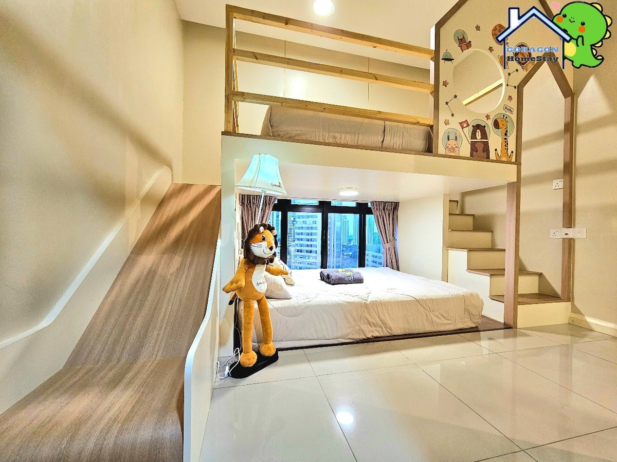 BEST. LEGOLAND. VIEW This is a High Floor room with the Best Legoland view that you will have from Living Hall --> Bedroom 2 --> Master Bedroom. You will have a cozy, comfort and nice sleep here in this house^^ WHAT'S SPECIAL ABOUT THIS HOUSE? It has an INDOOR PLAYGROUND for yourself! It's PLAYFUL ENOUGH and yet ALSO COSY ENOUGH for your kids. You can either climb and shake your energy off or snuggle yourself at the cosy corner inside the playground house.