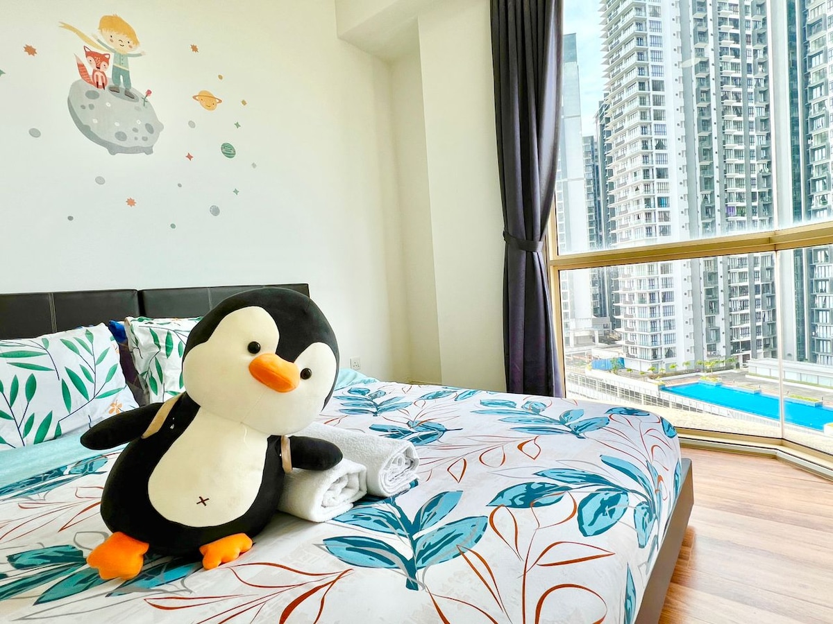 New 3 BR at Paradigm Residence, directly above Paradigm Mall! Take lift down directly to shops! Kids and baby friendly! - Spacious main BR with King size bed - Multiple bed config for bedroom 2 - 1x Super King or 2x single beds. - Bedroom 3 - sofa queen bed & study table. Suitable for WFH. - Additional tilam, baby cot/chair/mat - Fastest Wifi 800mbps fiber. Netflix & international tv box! - Impromptu stay no problem! Towels toiletries dental kits phone chargers water coffee tea washer+dryer.