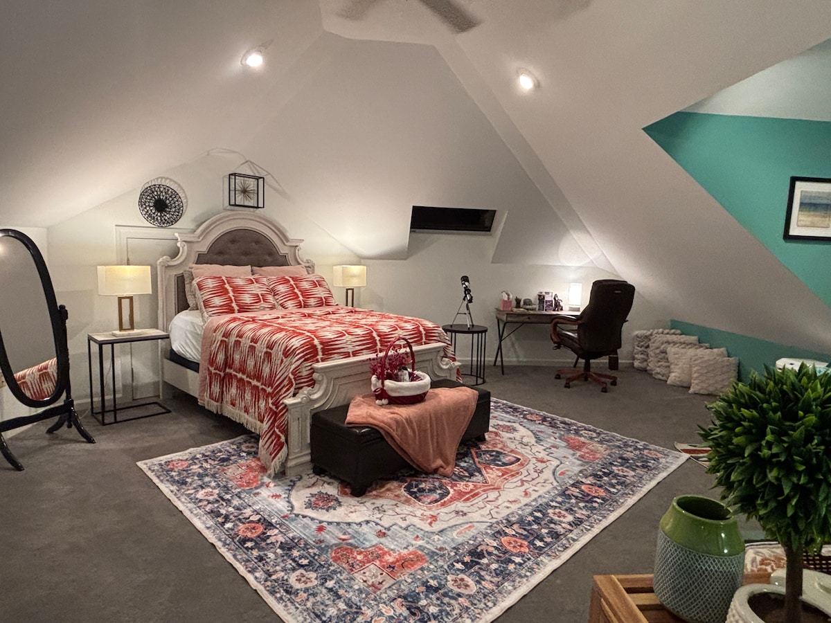 Your guest room is located at DaySpring Oasis, a 7,500 sq ft country estate set on 5.31 acres of natural beauty. The property features a spring-fed pond, two waterfall ponds, and a flowing creek. Enjoy shared access to the pool, spa, patios, and gazebos. Traveling as a group? Additional rooms are available on site.