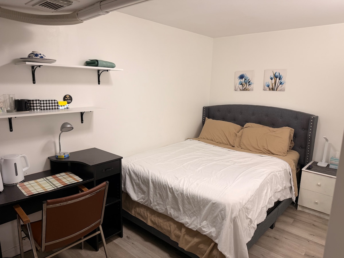 🏡 Enjoy a peaceful stay in this private studio suite located in a quiet, safe neighborhood. Perfect for solo travelers and professionals, it features a queen bed, private bathroom, dedicated workspace, fast WiFi, and Netflix TV. Prepare simple meals with a microwave, airfryer, mini fridge, and coffee maker. Includes private entrance, shared laundry. Free street parking, and long-term stay options for a comfortable and convenient experience.✨