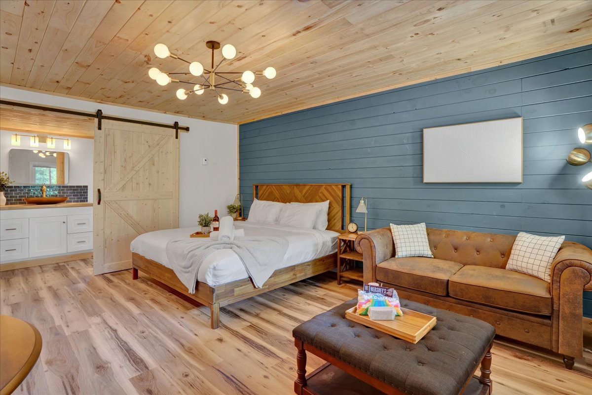 Enjoy a spacious king suite with a pullout sofa and sitting area. Amenities include: Simmons Beautyrest Black luxury pillow-top mattresses Refrigerator in room Smart TV with Roku access Sliding barn style bathroom door Tub with Moen shower head In room safe Conair handheld garment steamer Free WiFi 24/7 Front Desk Staff to assist with needs
