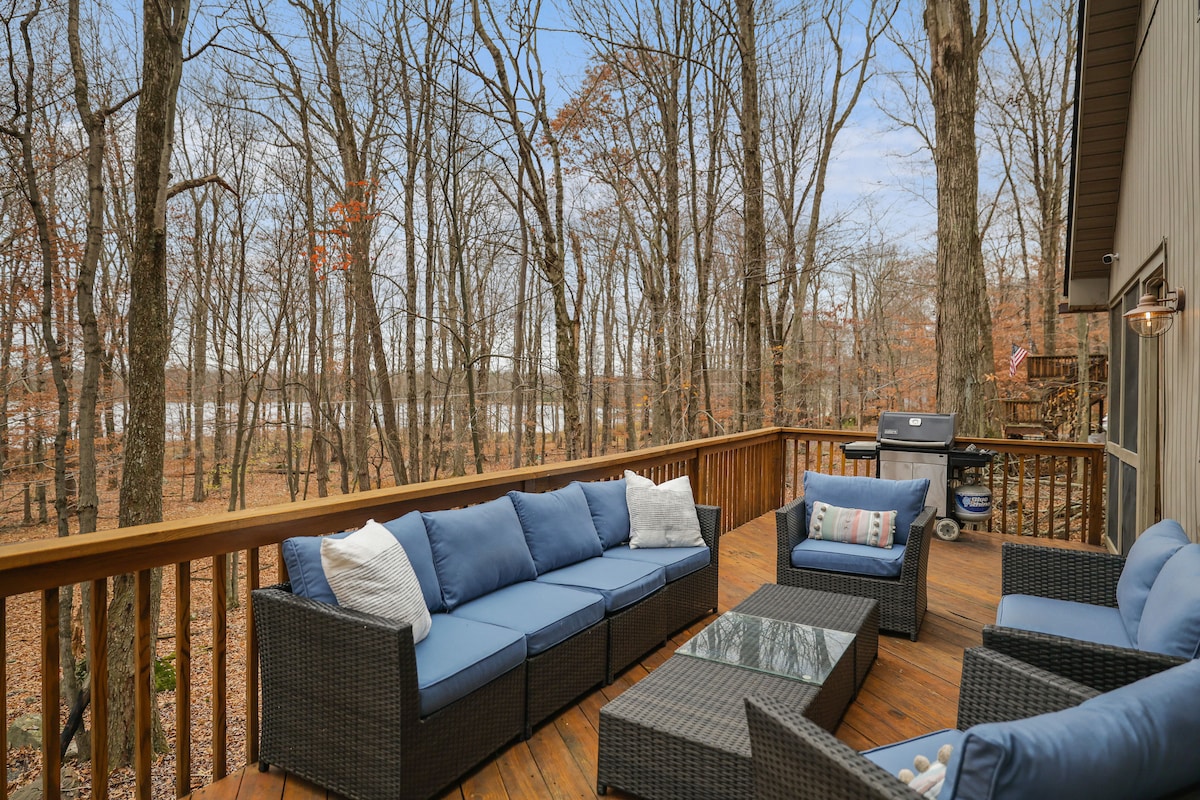 Tucked inside the Pocono Mountains a newly refreshed, modern, expansive & family welcoming chalet in an amenity filled community Private 3000sqft 4bed3bath escape resting on 1.5acres with uninterrupted views into a protected woodland preserve Enjoy the sauna, new hot tub, game room, fireplace, fire pit Community offers 5lakes, 3beaches, fishing lake, 2pools, playgrounds, tennis & basketball courts Moments from bird watching, hiking, wineries, skiing, indoor waterparks, golfing & casinos