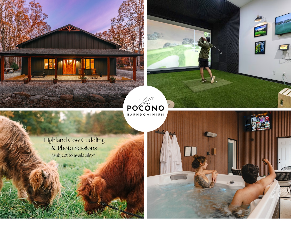 A truly unique stay in the Pocono Mountains, home to rolling mountain terrain, breathtakingly beautiful waterfalls, thriving woodlands, + 170 miles of winding river. Created with the “ultimate night in" themed experience, guests can sip wine under the stars in a private hot tub, + enjoy movies on their own 135" movie screen equipped w/ the world's first LED 4K gaming projector. Enjoy themed bedrooms and experience a stay where the forest takes you away as you stay in ultimate comfort + luxury.