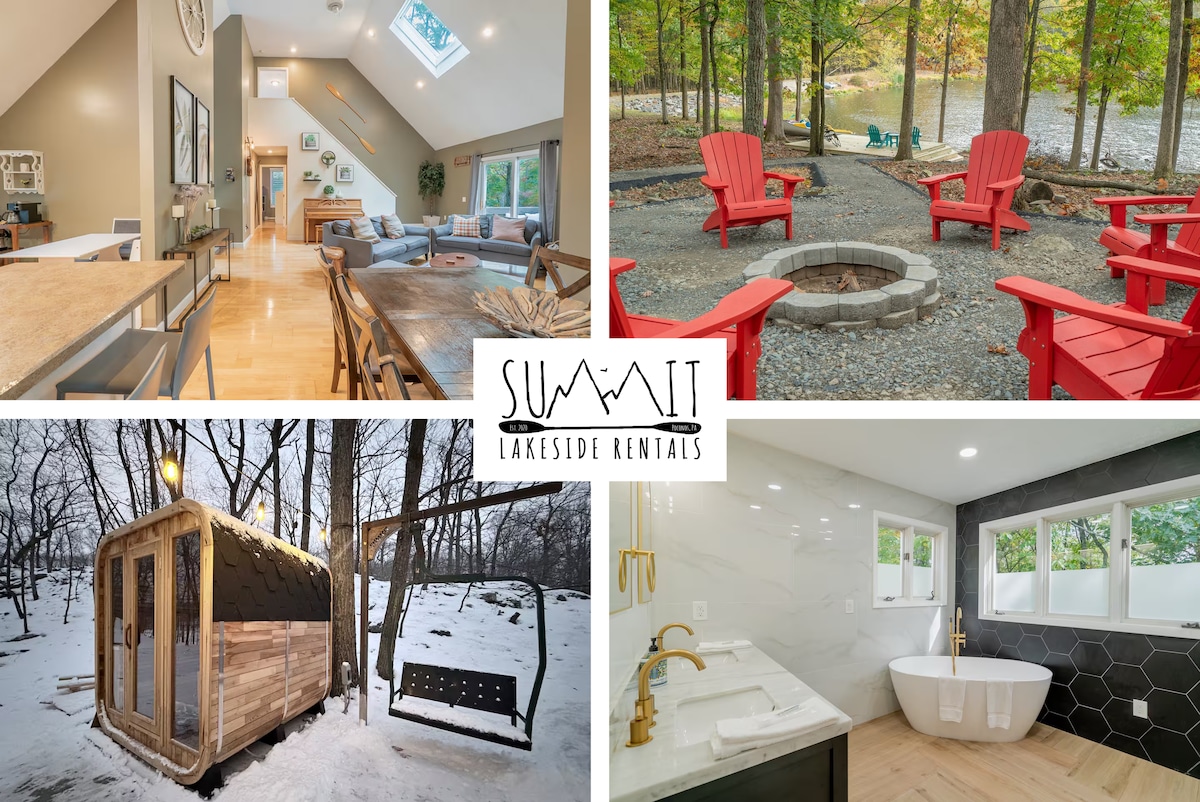 Newly renovated 4BR/3BA chalet on 10 private wooded acres in the Pocono Mountains. Sleeps up to 12 guests and is packed with amenities: a sauna, indoor fireplace, outdoor fire pit, two dedicated workstations with fast Wi-Fi, a yoga space, sunroom, and a fully stocked kitchen. Whether you’re seeking adventure or relaxation, you'll have quick access to the Pocono Mountains top attractions—whitewater rafting on the Lehigh River and skiing at Blue Mountain, Camelback, Jack Frost, or Bear Creek.
