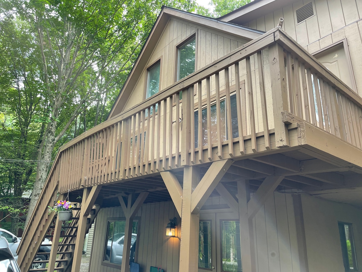 “Parkwood Manor" at Bear Creek Lakes is a brand new 3600 sq ft Chalet home in a quiet wooded setting in the Poconos. Grand 2 story FR with stone gas fireplace. All HW floors except bedrooms, granite countertops, and new appliances. All rooms have flat screen TVs and ceilings fans. Basement has a pool table/air hockey combo table, foosball table, dart board and board games. Wrap around covered deck, and outdoor fire pit. Community has lake beach, swimming pool, tennis. Great for family groups!