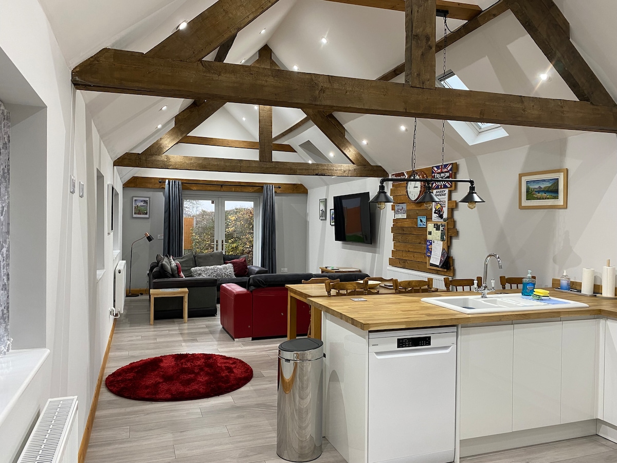 CHECK IN AFTER 3pm and BEFORE 8pm unless prior arrangements are made with the host. NO PETS OR PARTIES. NO ADDITIONAL VISITORS WITHOUT PRIOR ARRANGEMENT with hosts. CHECK OUT BY 11am. This new beautiful, cosy, barn conversion. The barn has a well equipped kitchen/dining area with lounge and large 65inch smart TV. A master bedroom with super king bed and en-suite the second bedroom has an option of super king bed or 2 singles and a beautiful full bathroom with roll top bath and shower.