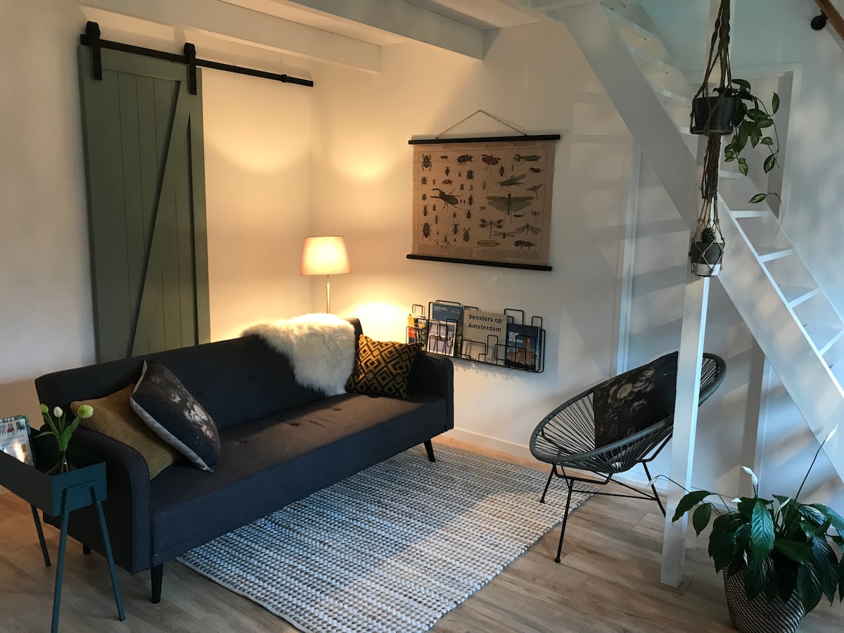 In het oude centrum van karakteristiek en unique Broek in Waterland in een in 2017 opnieuw gebouwde schuur achter de boerderij. Geheel eigen woning met toegang (zelf in-check). Split-level met privé tuin. Beneden (24 m2) is de woonkamer met bank, mini keuken, eethoek en aparte badkamer en wc. Op de vide is de slaapkamer met 2-persoons bed, genoeg kastruimte, hang en leg. Wifi aanwezig. Er zijn twee fietsen (Veloretti) te huur, 10,- per fiets per dag.