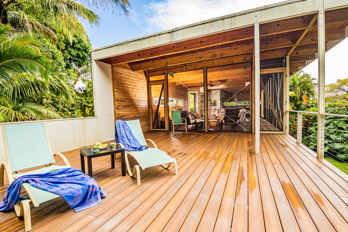 Feel the tropical vibe as sunlight pours into a fun and unique 12-sided home with a central dome skylight and vaulted ceilings. Casual, stylish furnishings, playful textiles, beautiful Balinese hardwood floors, a well-appointed kitchen and a deep, jetted tub with an oversized rain-showerhead create an inviting interior. Outside is the irresistible allure of your own private pool surrounded by lush greenery made complete with a soothing outdoor shower. Enjoy exotic flowers, fruit trees, native plants, and a beautiful lava-rock wall landscaped to give you complete privacy. Close to Kehena Beach!
