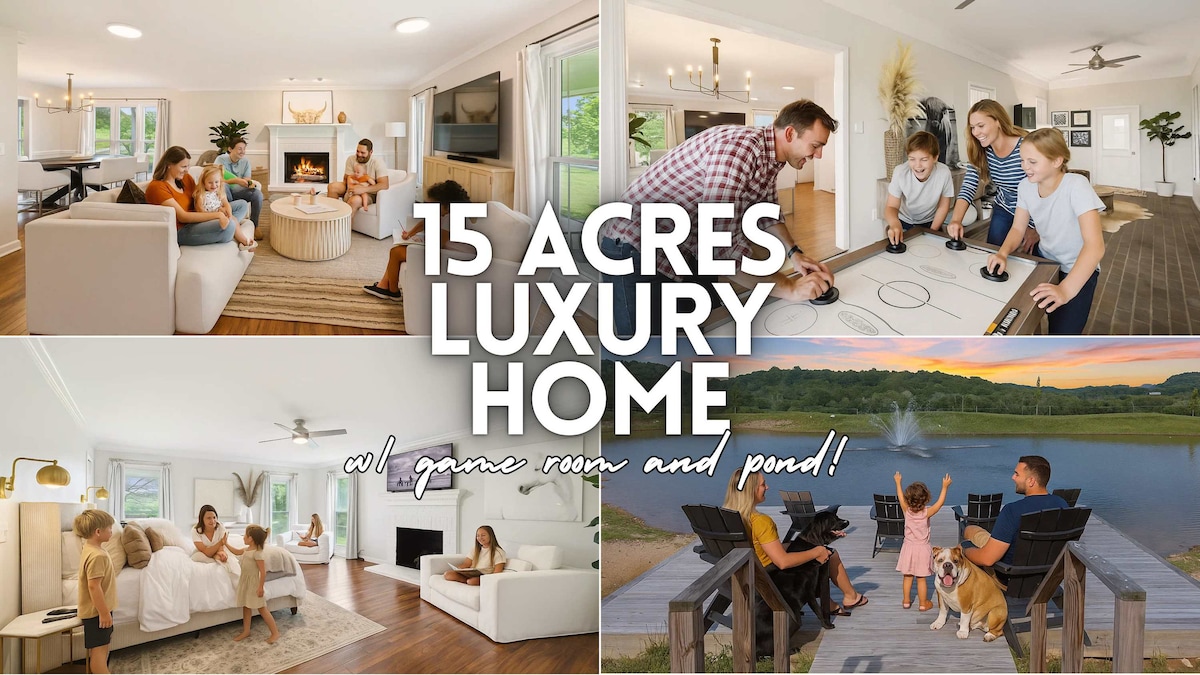 Escape to Lyric at Leiper’s Fork, a peaceful 12-acre retreat near Franklin & Nashville. This spacious single-level home features four King beds, a game and movie area, reading nook, and rocking-chair lined balcony overlooking the hills. Enjoy evenings by the fire pit and mornings with coffee on the porch. Perfect for families, couples, girls’ trips, and groups seeking comfort and connection in Tennessee’s countryside. 💲SAVE ON WEEKLY STAYS (auto applied)💲 👇 Full description below👇