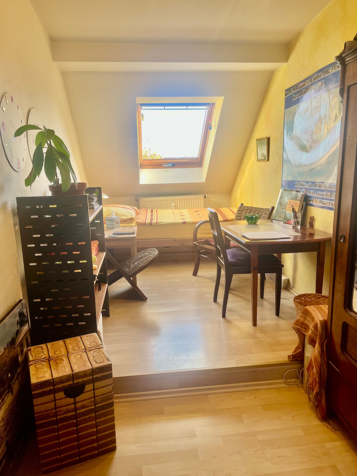 In dieser charmanten Jugendstilvilla (1906) wurden Schlafzimmer, Küche und Bad in der 1. Etage für dich liebevoll und mit besonderem Ambiente eingerichtet. Im idyllischen Muldental kannst du Radfahren, lange Spaziergänge im Grünen unternehmen, oder kreativ arbeiten. Den großen Garten mit seinen verschiedenen Sitzmöglichkeiten, den Wintergarten sowie eine finnische Sauna darfst du gerne mit uns teilen. Wir bewohnen das Erdgeschoss und bereiten dir auf Wunsch auch ein Frühstück zu.