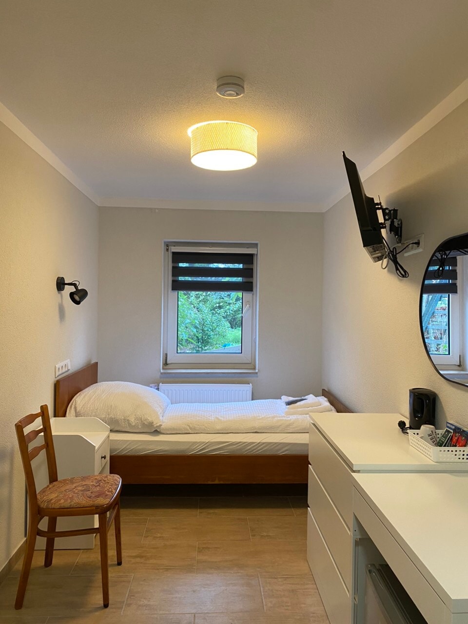 Cozy little guesthouse on a private, quiet property – ideal for trade fair visits or city trips. Equipped with a built-in kitchen (stove, fridge, microwave), TV, and Wi-Fi. The minimalist yet functional atmosphere provides everything you need for a relaxing stay. Bathroom with shower available. Only a 5-minute drive to the Leipzig Trade Fair or a direct tram connection takes you to the city center in just 10 minutes. A contact person is always available on-site.