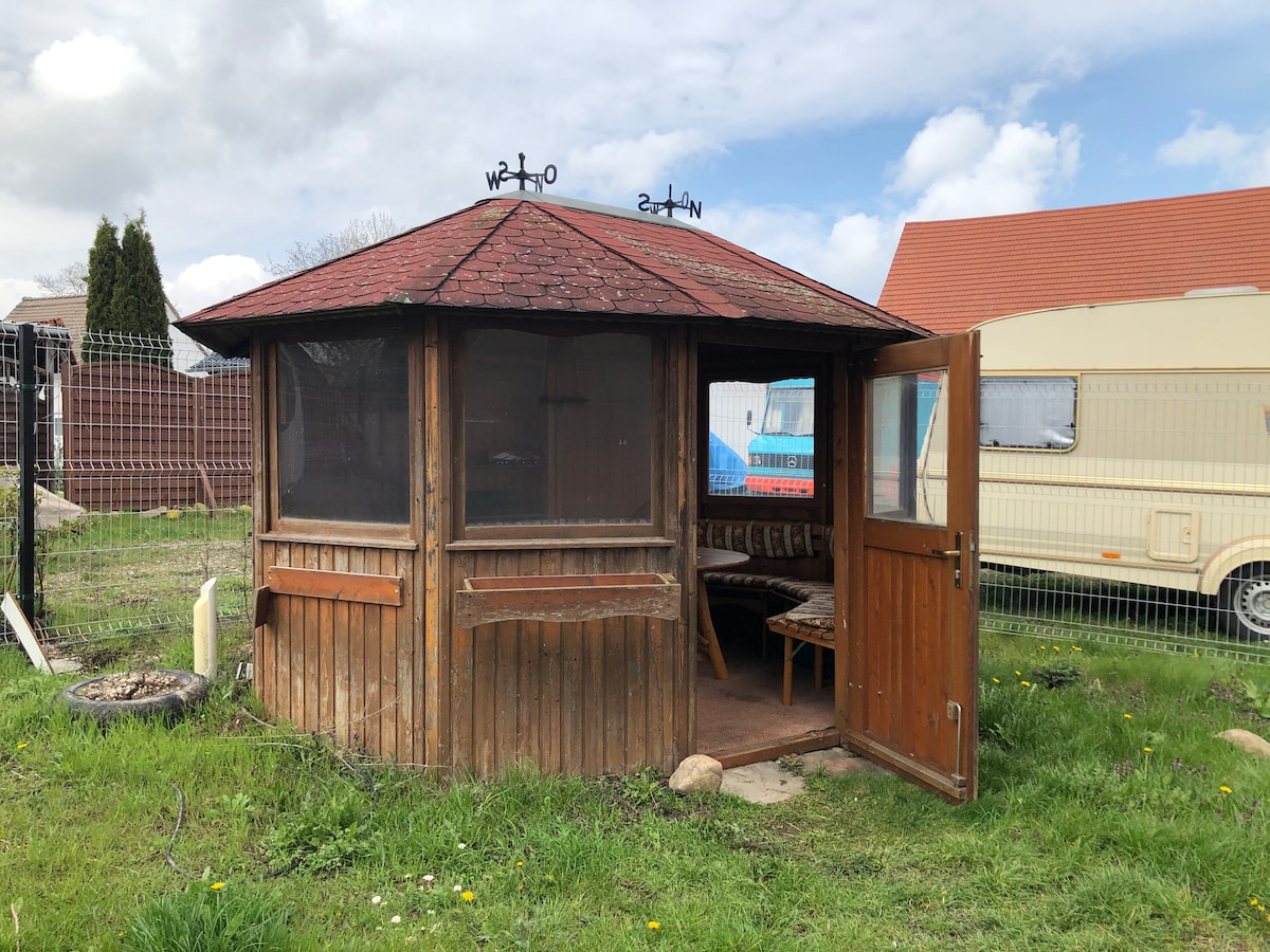 Idyllisches im Grünen befindliches Gartenhaus im großem Grundstück des Vermieters, kleine voll ausgestattete Küche (neu: Espresso-Kapsel-Maschine), Bad mit Dusche und Waschmaschine, kombiniertes Wohn-/Schlafzimmer mit bequemem Boxspringbett 1,80 * 2,00 m, Elektrokamin, großer Fernseher, Blurayplayer ..., Ankleidezimmer mit Ruheliege und Infrarotsauna für 2 Pers., ca. 5 min Fußweg zum Völkerschlachtdenkmal, Straßenbahn-, Bus- und S-Bahnhaltestelle in der Nähe, gute Erreichbarkeit der Innenstadt