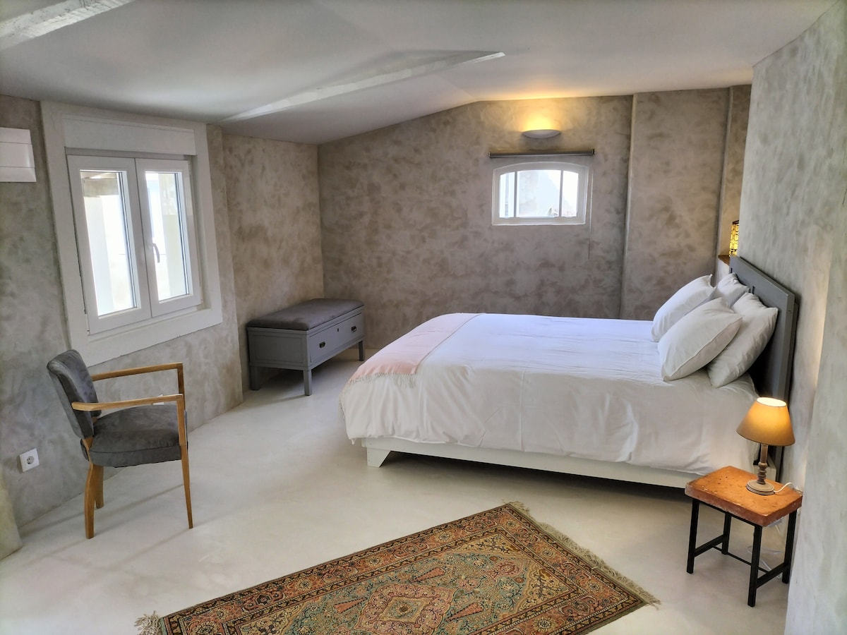 House with open-plan lounge and kitchen, 2 bedrooms - one with a double bed on the ground floor, the other with 2 single beds on the upper floor, and 1 bathroom. It has heaters in the bedrooms, air conditioning in the living room. The living room has a fireplace. The stairs to the second bedroom are Santos Dumont stairs: sloping, with each step going back on the side that won't be used for the ascent). Among the services we offer is breakfast, which is optional (8€ a day, per person).