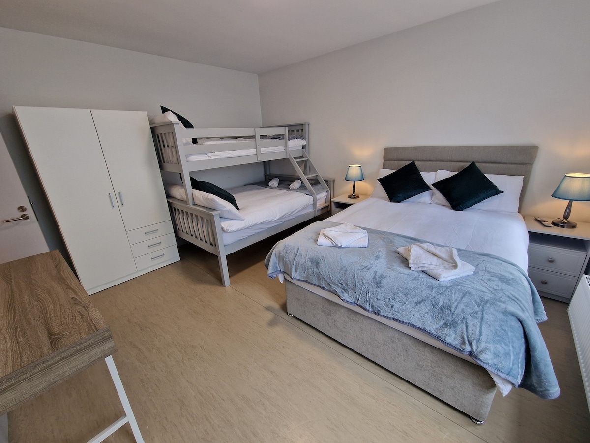 The whole group will enjoy easy access to everything from this centrally located ground floor apartment in Carrick-on-Shannon town centre, Free parking across the street or in large car park close by. Three bedrooms, one ensuite and one main bathroom plus large kitchen living room area.