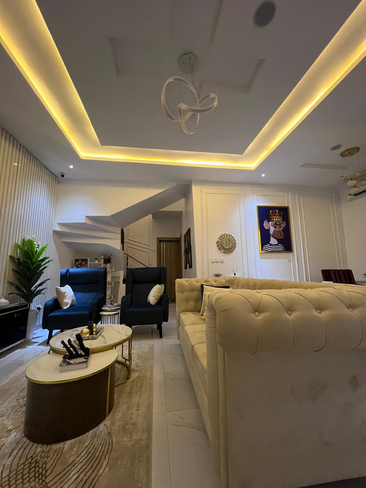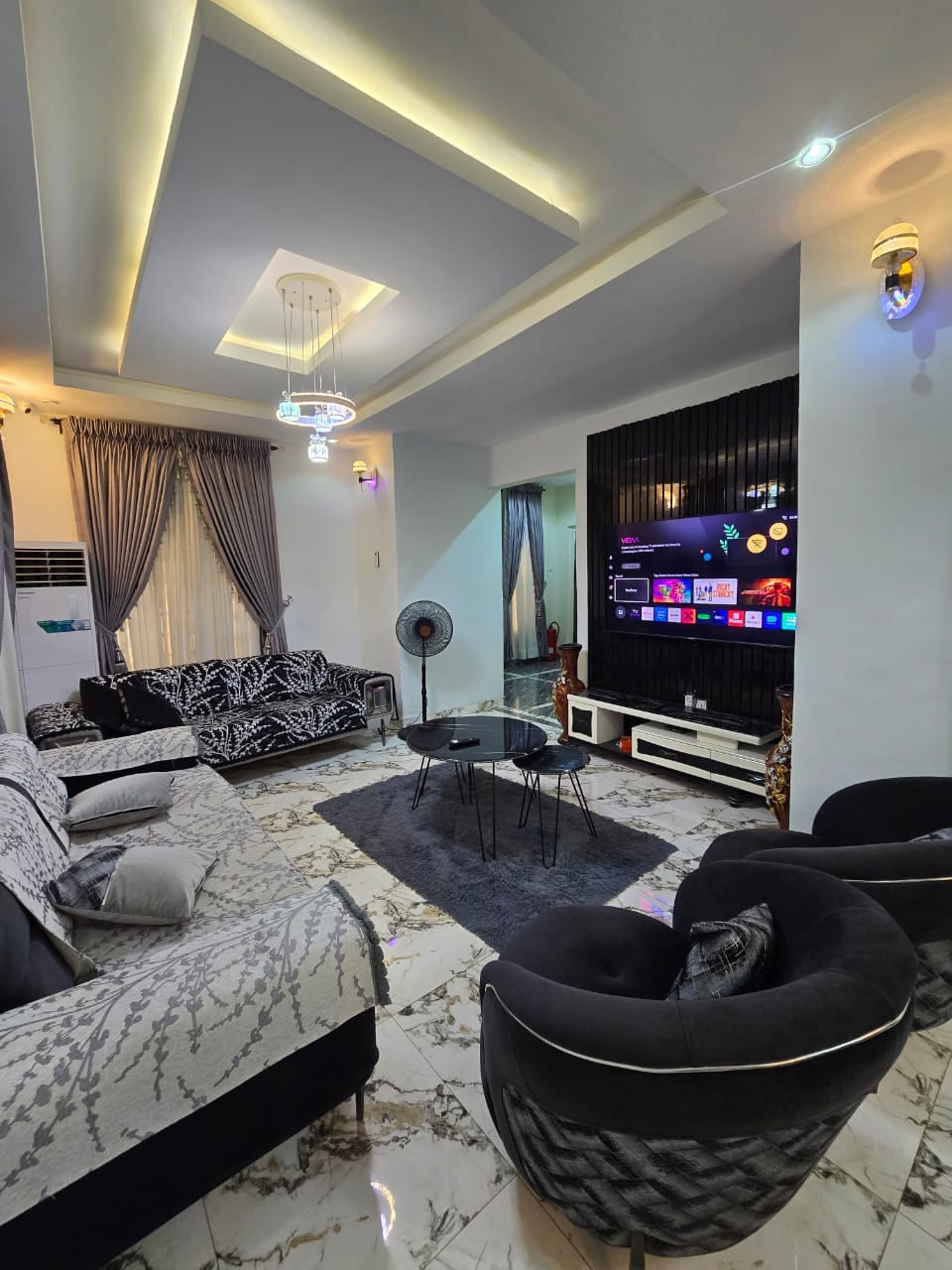 Features & Amenities • Alexa welcome home •PS 5 on request • smart curtains •smart in-built speakers • Balcony space • Free Wi-Fi• Snooker & table tennis • Wine rack • Smart lock • 24/7 electricity & security •Fully air-conditioned Smart TV (Netflix, prime video & DSTV) • En suite bedrooms •Kitchen & Utilities •Gas cooker •Microwave •Oven •Fridge •Washing machine• Water heater •Complete kitchen utensils •Free parking space •Cleaning service Serene environment •Clean water Good drainage system