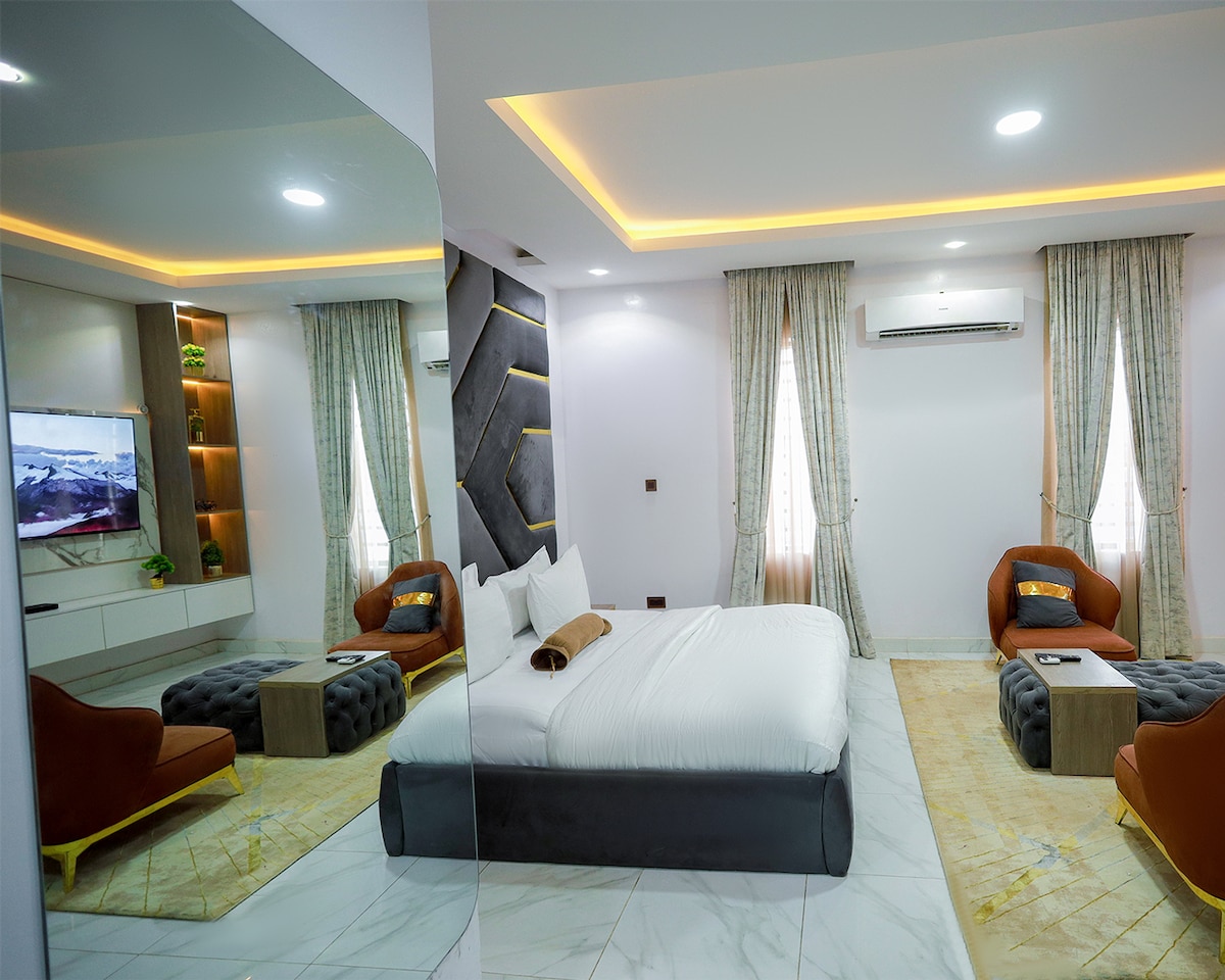 Spacious sitting room and royal ensuite room with Super king bed, modern bathroom and toilet 🚽. Very clean and standard apartment. Royal Pent House gives you all modern comfort beyond your imagination with unlimited high speed WiFi, 43inchSmart Tv in the bedroom and 55inch Smart Tv in the sitting room, YouTube, Netflix, DSTV. Comfortable Sofa, Water heater, Water kettle, Microwave, Cooking gas. Smoke Alarm, Mono dioxide Alarm, 24/7 power. , Cctv, maximum security with 24/7 security personnel