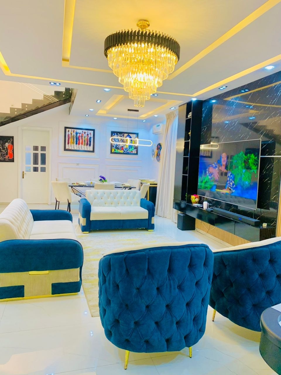 Tuns Palace is a stylishly designed luxury home with extra modern facilities. It is located in a serene and secure estate just before banana island, it is a fully automated smart home with voice activated lights and A.C, fitted with a family sized Cinema room, outdoor Jacuzzi with a view that overlooks the lagoon.