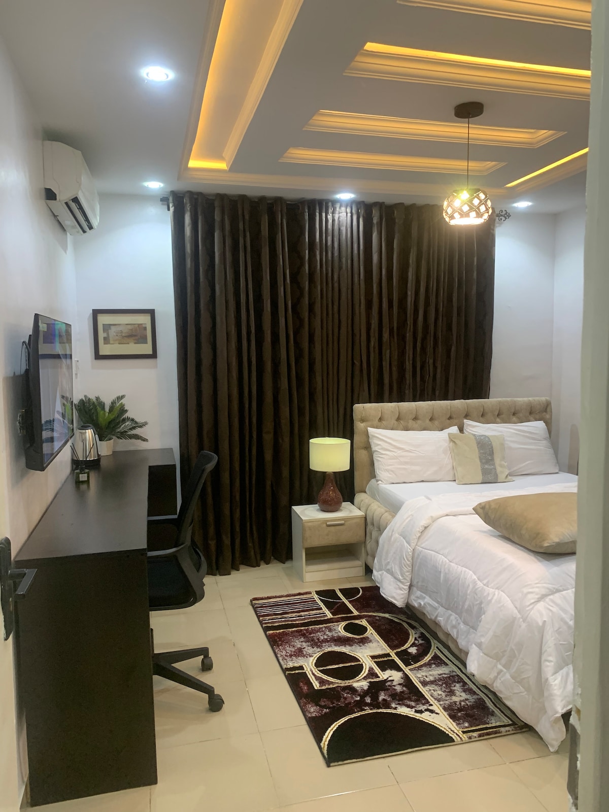 Come stay at our private, quiet, and simple apartment located in the heart of Lekki. This spacious room is perfect for traveling friends or a family looking for a peaceful stay. It includes a queen bed, living room (with a sofa bed), 1 bath, and 1 full-size family kitchen. Enjoy amenities like 24/7 electricity and fast-speed internet service. There is plenty to do within walking distance, including bars and restaurants, or you can relax at home and watch Netflix on the Smart TV.
