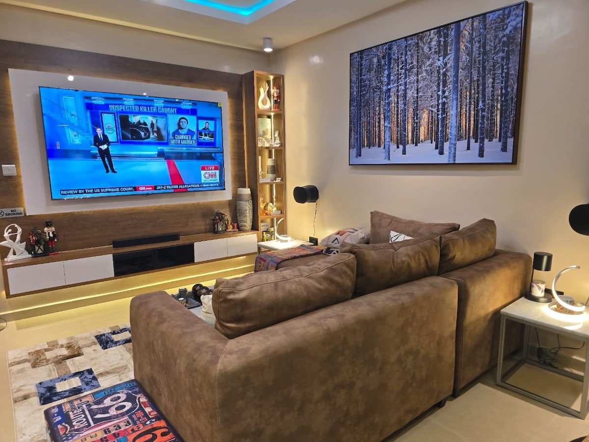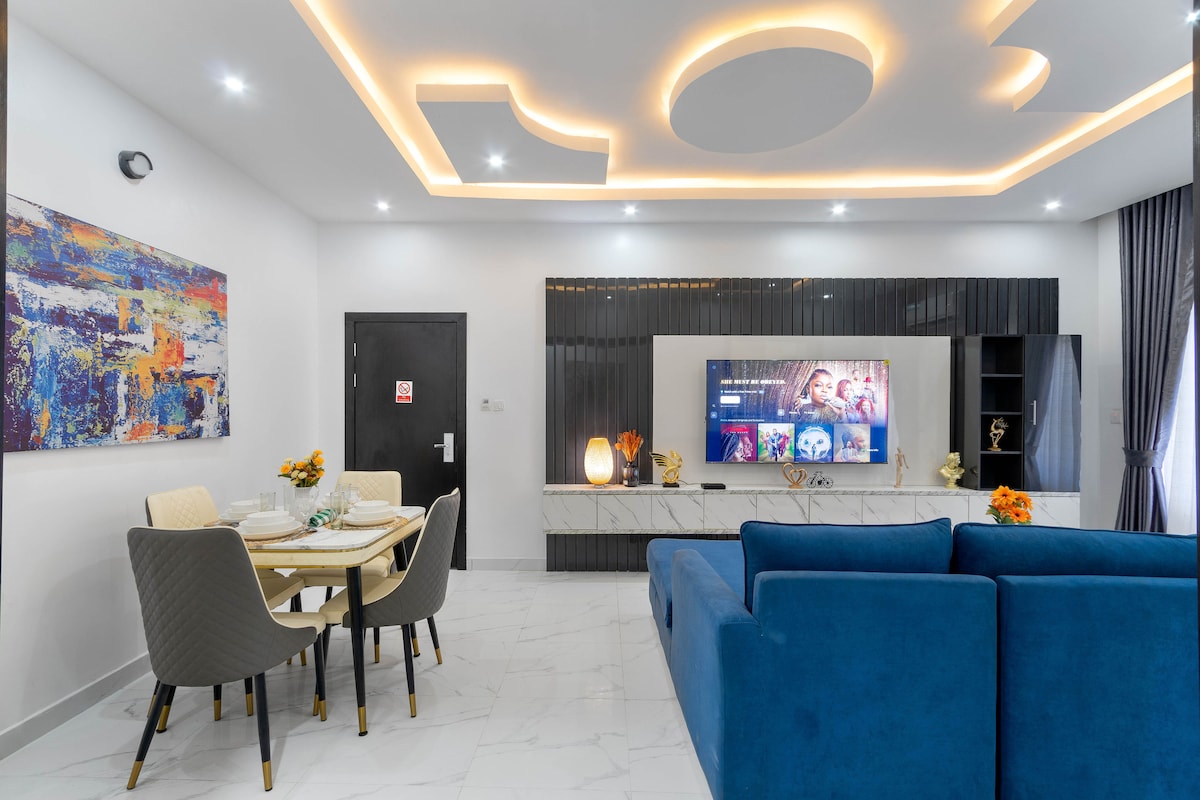 Welcome to Elmstead Luxury Aprt , your stylish retreat in Lekki Ikota. This 2BR/2BA haven offers A/C comfort, a 65″ TV in the living room, 43″ TV in bedrooms, free stable unlimited Wi-Fi, and 24/7 power with inverter & solar. Enjoy smartlock self check-in, free parking, an in-unit washer, and a kids’ bouncing castle. 1 Free cleaning for stays over 5-6 nights. Close to Lekki conservation Center, Mega Chicken, Blackbell & Blemco. perfect for solo travelers, business guests, families, or long stay