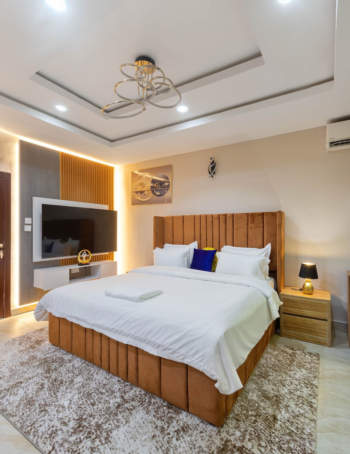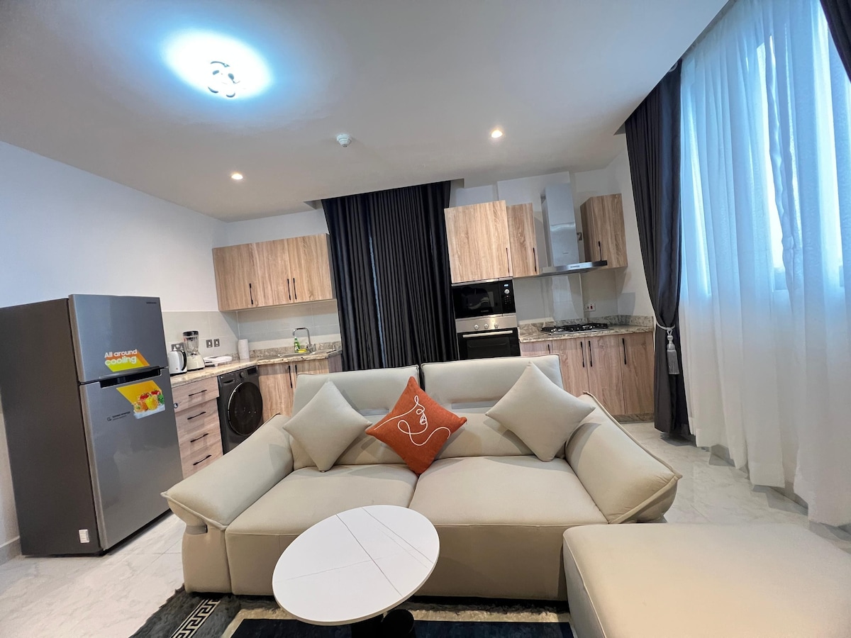 A Brand New ,Well Finished 1 bedroom apartment for Short let. It a perfect place for business traveler with discerning tastes looking for excellent value accommodation. Features: * All rooms ensuite * WiFi * Front water view * Onsite maintenance & house keeping * Elevator * Fitted Kitchen * Ample parking * Cctv * 24hours Power Supply * Fitted Air Conditioners * Fire alarm system