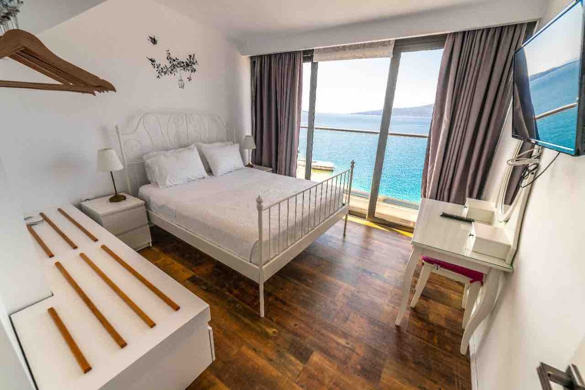 Have you ever imagine waking up from the sound of the waves in a big, bright apartment with a Maldives alike seaview? This is a very spacious apartment in the very first line from the sea. The apartment is furnished with modern furnitures and appliances. It is located in the port neighborhood of Saranda in a 10minutes walk from the center.Relax in a peaceful enviroment and enjoy the endless blue.