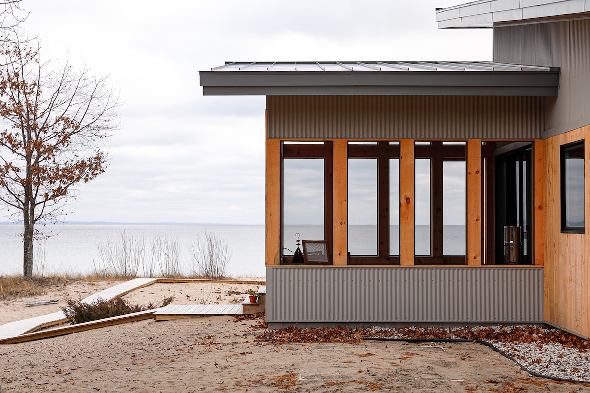 Stunning modern home with 150 feet of pristine private beach at the edge of Lake Michigan's Grand Traverse Bay. Come restore your body and spirit at our new house nestled on 2 acres of sandy woodland with access to great cycling and hiking trails. With toasty radiant floor heating and high speed wifi, this home can be your sanctuary for work or creative reflection. Enjoy the modern wood-burning fireplace and outdoor sauna, Peloton bike, yoga supplies and extraordinary lake views.